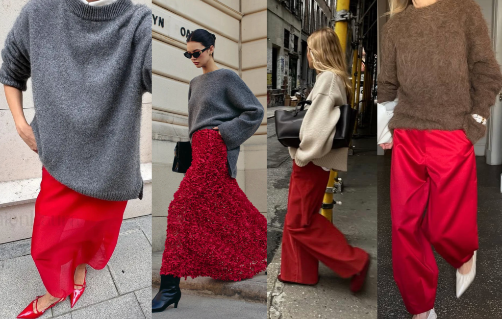 Wearing red on the bottom through a skirt or trouser is bold and impactful, but can be risky! Because red naturally draws the eye, trousers or skirts in this shade put all the focus toward your hips and thighs, making fit and silhouette especially important. The key to pulling off this look is choosing shapes that flatter your body: high-waisted trousers, fluid wide-leg cuts, or clean A-line skirts that create polished lines. Done right, red bottoms feel confident and chic.