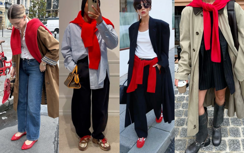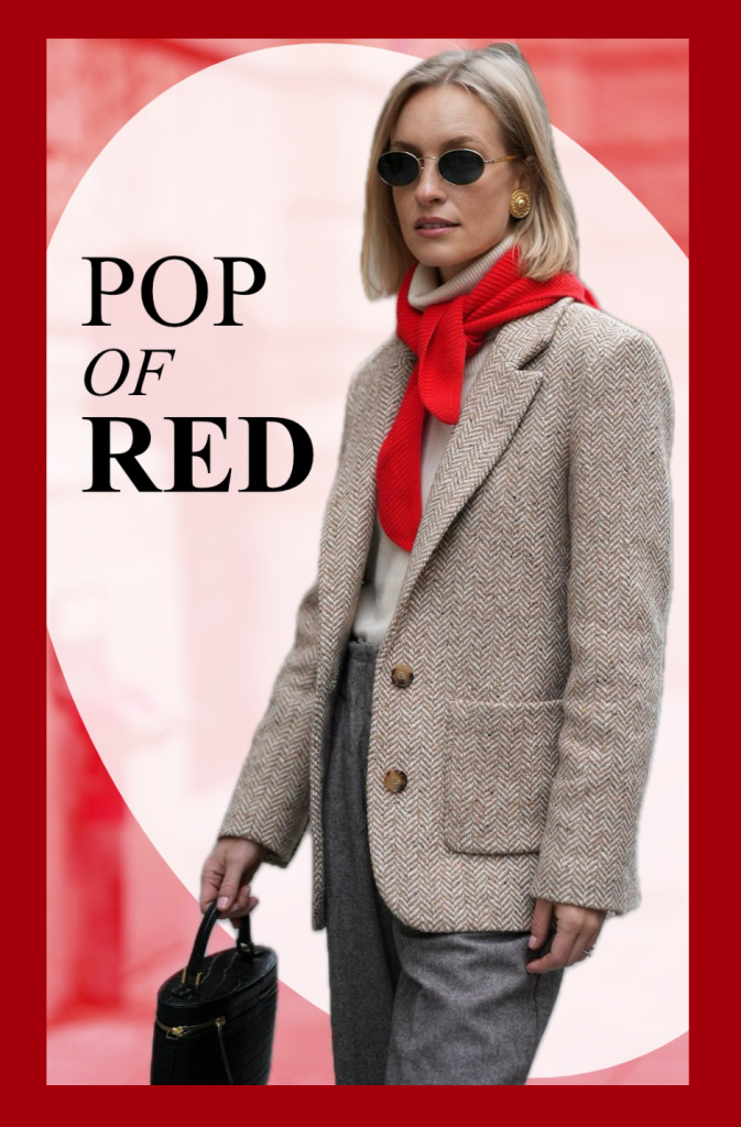 If you’re unsure about wearing red, accessories are the perfect entry point. A red handbag, statement hairpiece, socks, tights or scarfcan instantly transform a neutral outfit. Hottest trend this year: A red statement neckerchief scarf.