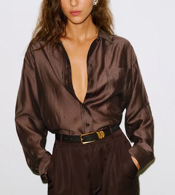 The Ralph tuck is a relaxed tuck method for button ups where the top is tucked entirely into the waistband, then gently pulled out to create ease and movement. There’s no precise folding, just a soft drape that feels both lived-in and intentional. The most faithful interpretation involves only buttoning 1-2 buttons from the bottom of your button up to create a loose puddling effect. However, you may achieve a similar look fastening more buttons based on how oversized your button up is. The main goal is to create shape without looking restrictive.